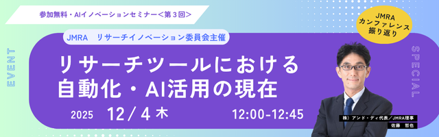 第3回AI・イノベーションセミナーは委員会でセミナーを担当している佐藤より、10/2に開催されたJMRAカンファレンスの振り返りを兼ねて実施いたします。