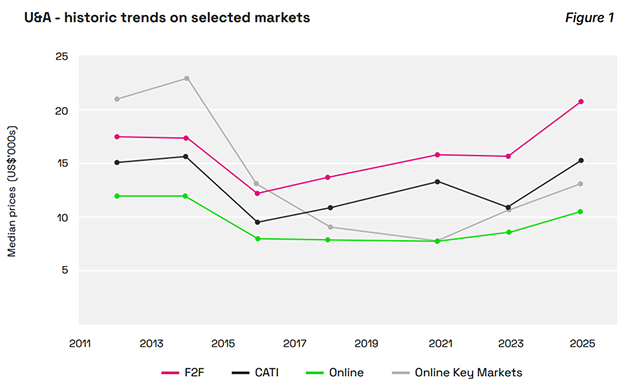 個別プロジェクト別の価格データについては調査年によるバラツキが大きく、評価の難しい面があります。詳しくはレポート本文をご参照ください。一例として、以下に最も一般的と思われるU&A調査の「F2F、CATI、Online、主要8カ国市場(世界市場の約8割を占める、米・英・印・中・豪・仏・独・日)に絞ったオンライン」の中央値に関するトレンドを掲載しました。全体として2025年はすべての数値が高騰していることがわかります。ただし、米ドル換算時の為替相場の影響が大きいことを考慮してください。