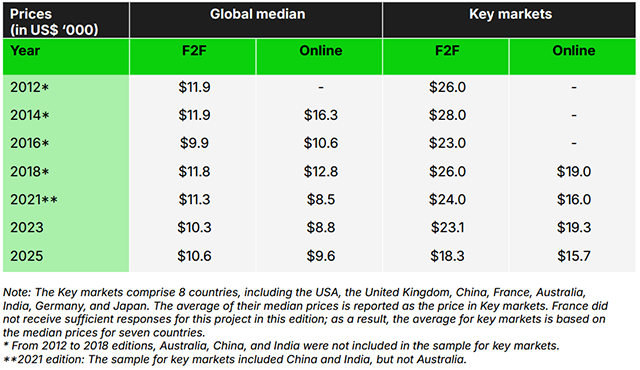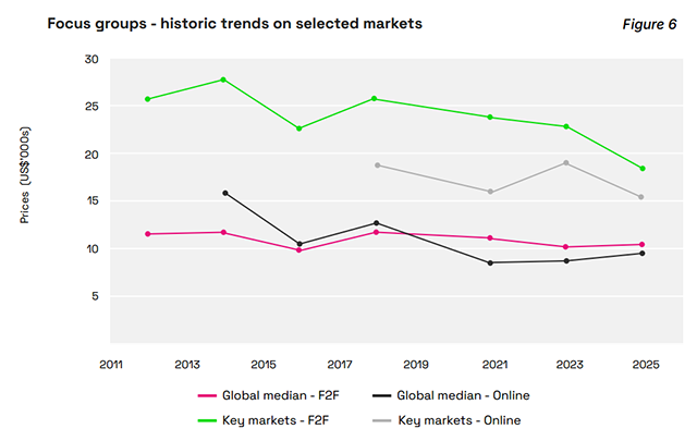 もう1つ、グループインタビュー(フォーカスグループ)4グループの価格についても見ておきたいと思います。例年、こちらは比較的安定していまして、コスト構造に大きな変化がないことが推測できるのですが、2025年は主要8カ国市場における価格がF2F、Onlineともに下落していることが気にかかります。