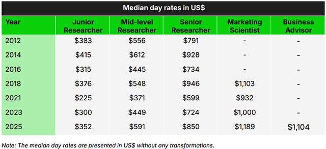 2023→ 2025年で、リサーチャーの日給単価は「17~32%上昇した」とされています。