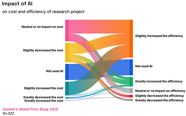 今回の調査では、AIが調査プロジェクトのコストと効率性に与える影響についても聞いています。すべての調査会社がAI活用に踏み込んでいるわけではないためか、回答者数(n=222)がかなり減少していますが、示唆を得ることは可能と思われます。結果は、